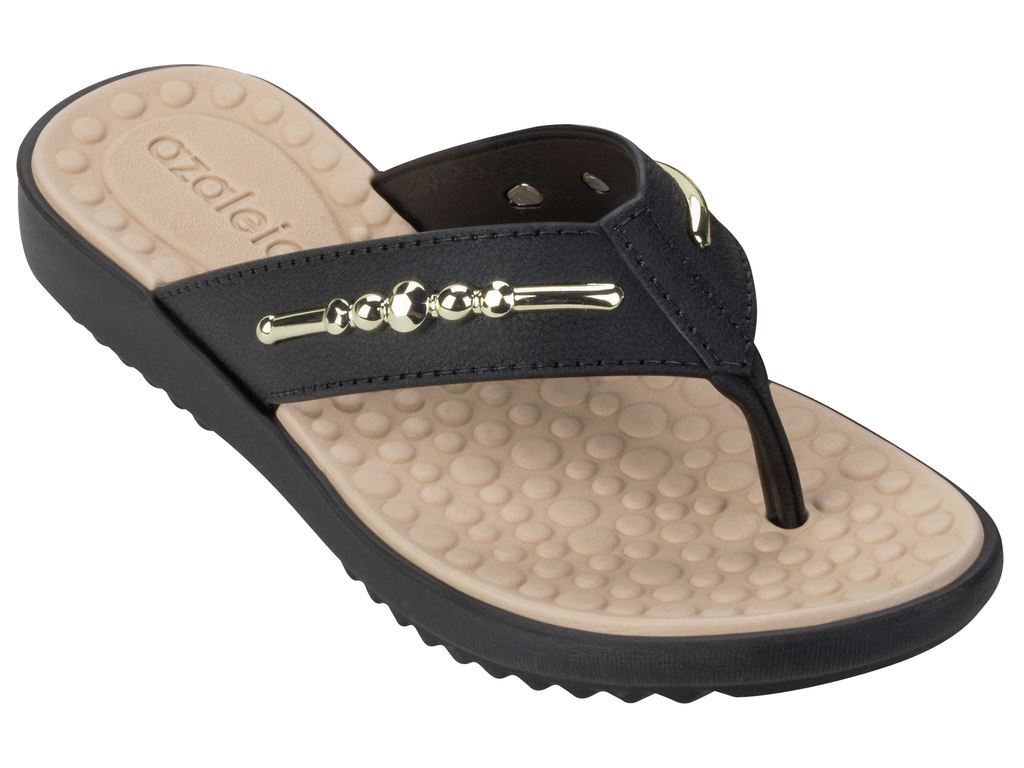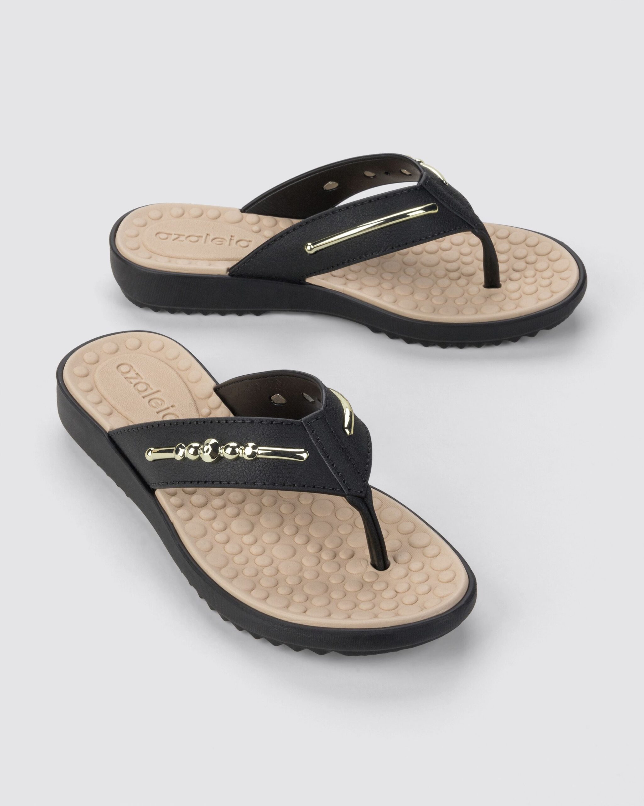 Esse lançamento de Azaleia traz atributos confirmados no universo de calçados com enfoque em conforto, como as tiras em proporções amplas e que, junto ao solado de altura mediana, traz maior estabilidade e segurança ao andar. O ponto de destaque é o detalhamento metalizado que também conta com formas inspiradas em pedrarias, estendendo-se por toda a tira.