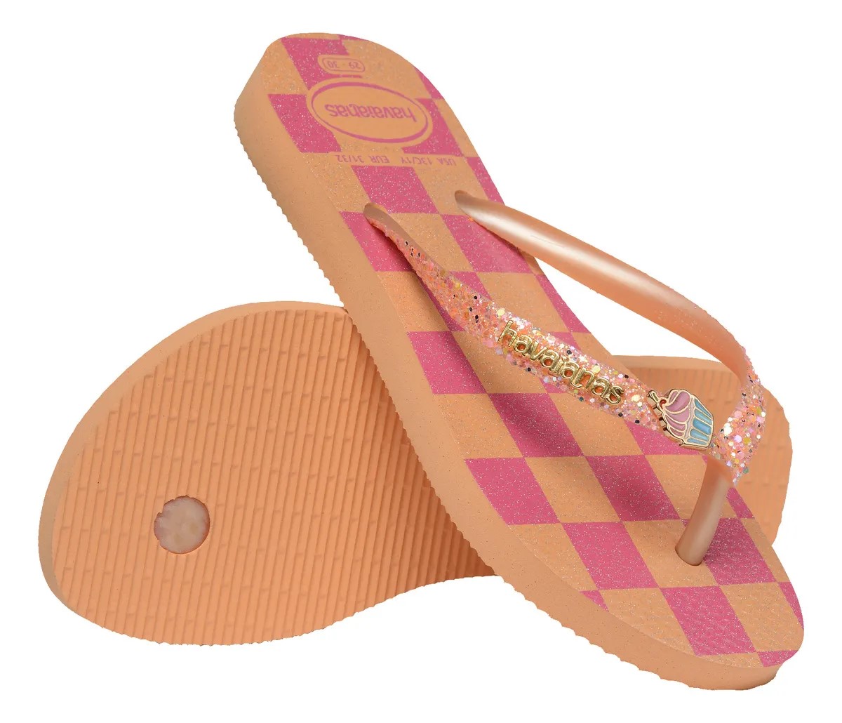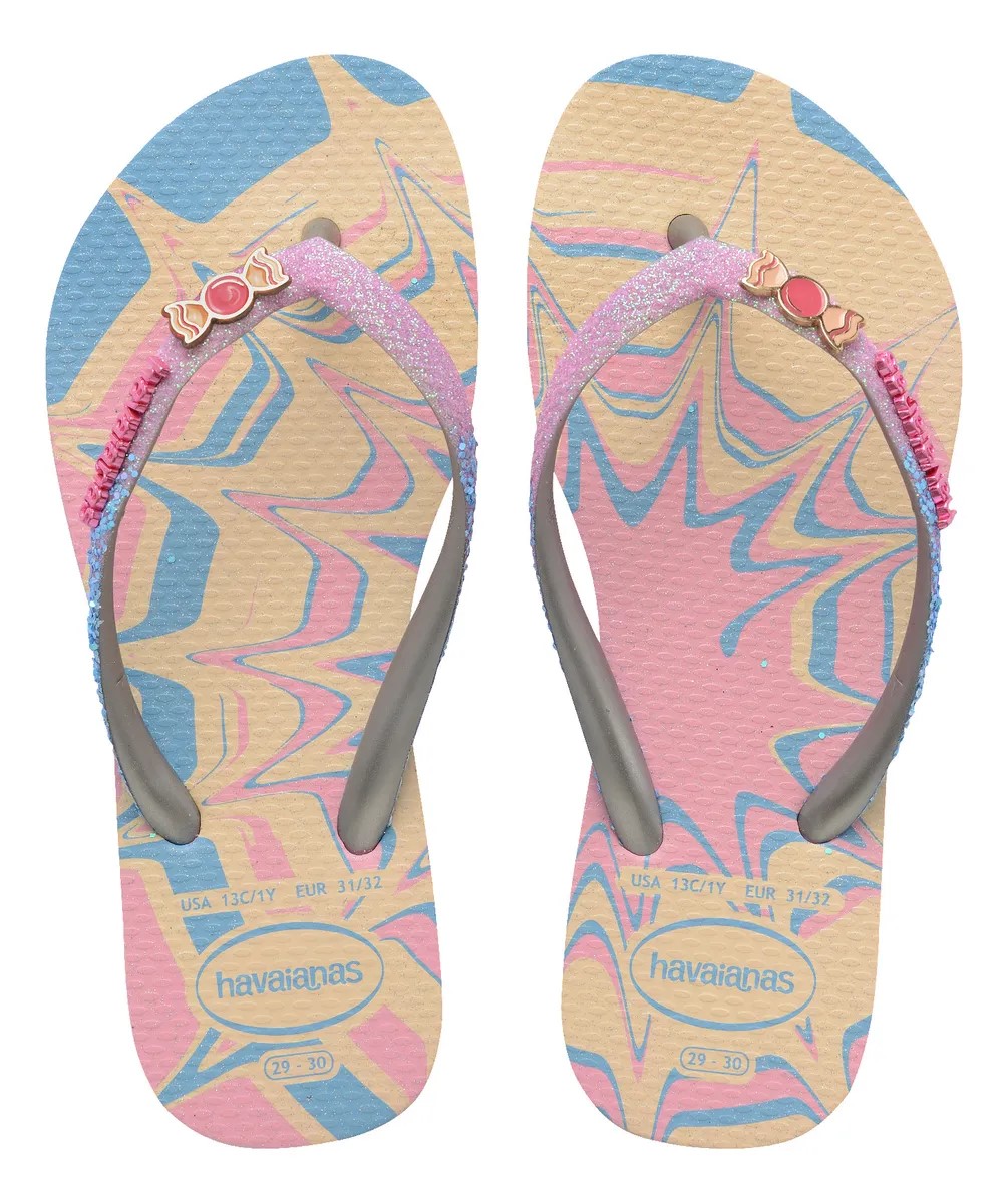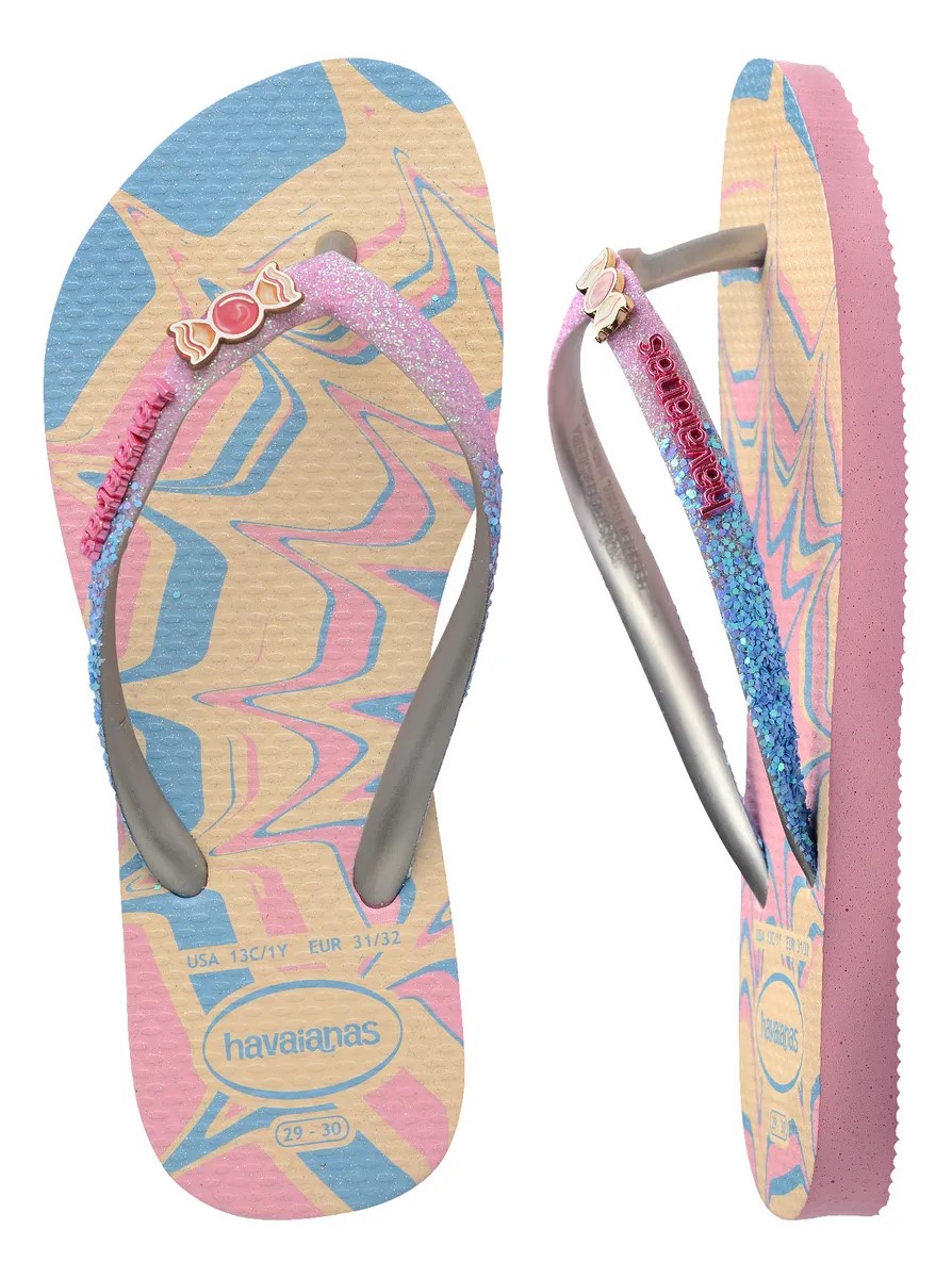 Tudo foi pensado para trazer uma explosão de brilhos e fofura no chinelo Kids Slim Glitter II. Essa sandália, com o modelo delicado da slim, com tiras e solado mais finos, possui as tiras metalizadas com aplicações de glitter que combinam com a estampa da sola. O toque final fica por conta de um pin em formato de doces e do logo Havaianas metálico. Compre já !