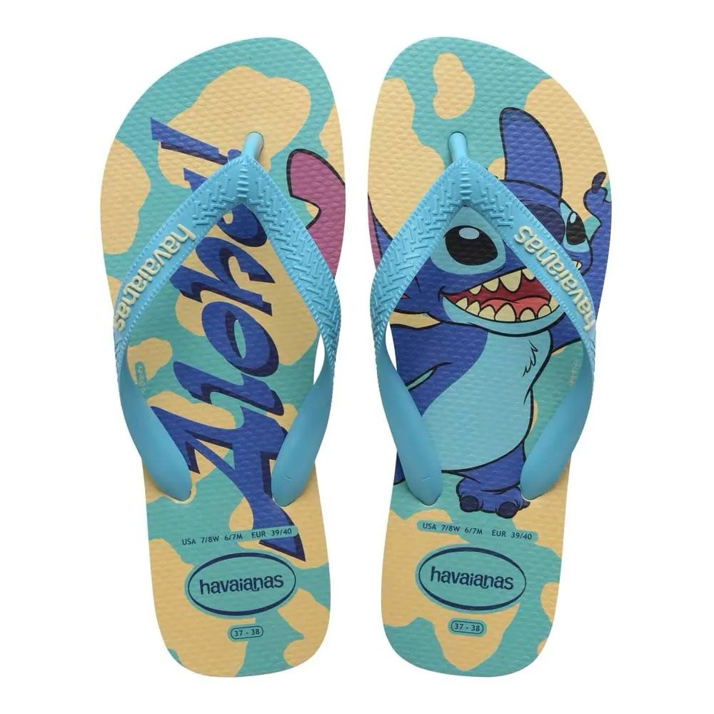 Sinta a magia da Disney a cada passo com o Chinelo Havaianas Top Disney Clássicos Stitch. Inspirado no espírito carismático do Stitch, ele traz palmilha estampada em tons vibrantes de azul e amarelo. As tiras tradicionais top exibem o logo contrastante Havaianas e proporcionam aquele ajuste confortável que você já conhece e ama. Perfeito para curtir a praia, passear pela cidade ou relaxar em casa com todo o charme e a irreverência do personagem mais fofo de Oahu.