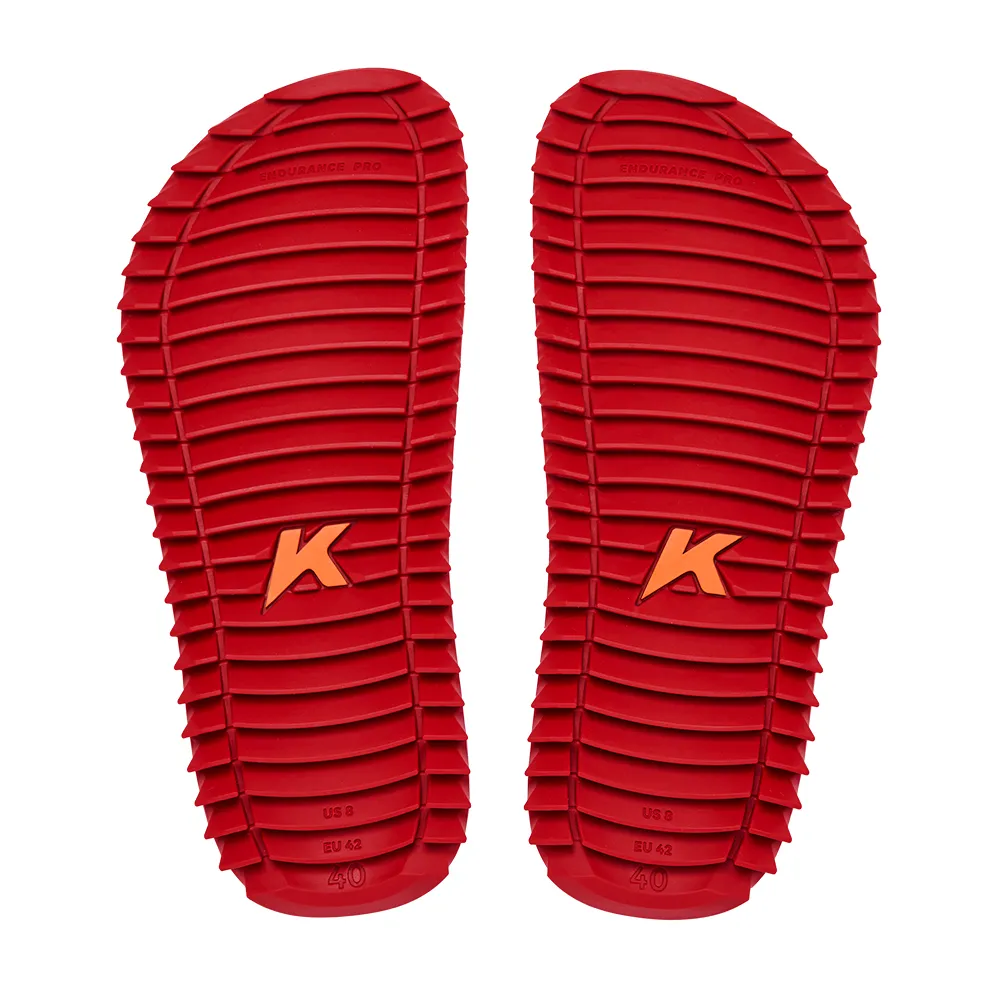 | Solado na cor vermelho com design tratorado e antiderrapante em borracha vulcanizada |